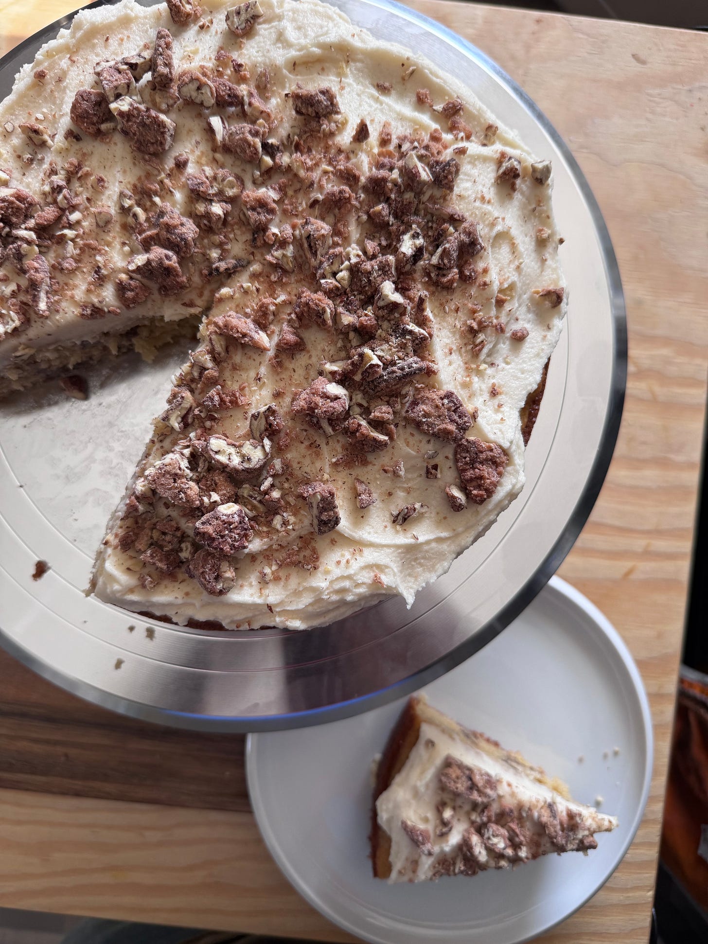 I bought Maple Sugar back in Michigan over the summer and I’ve had it on my shelf waiting for something to do with it. I love pecans on cake, but wanted an added texture so I knew candying them with the maple sugar was the perfect call.