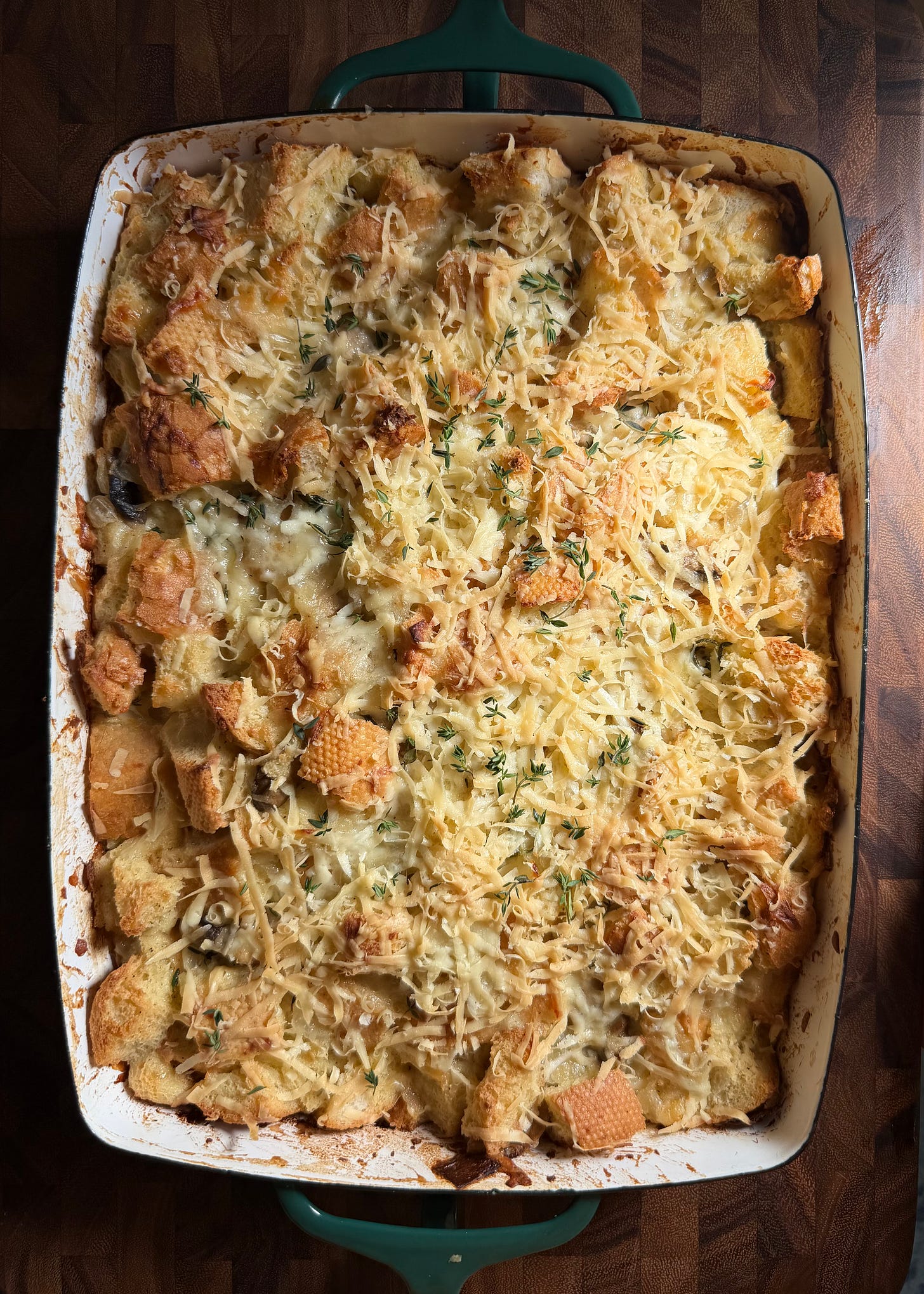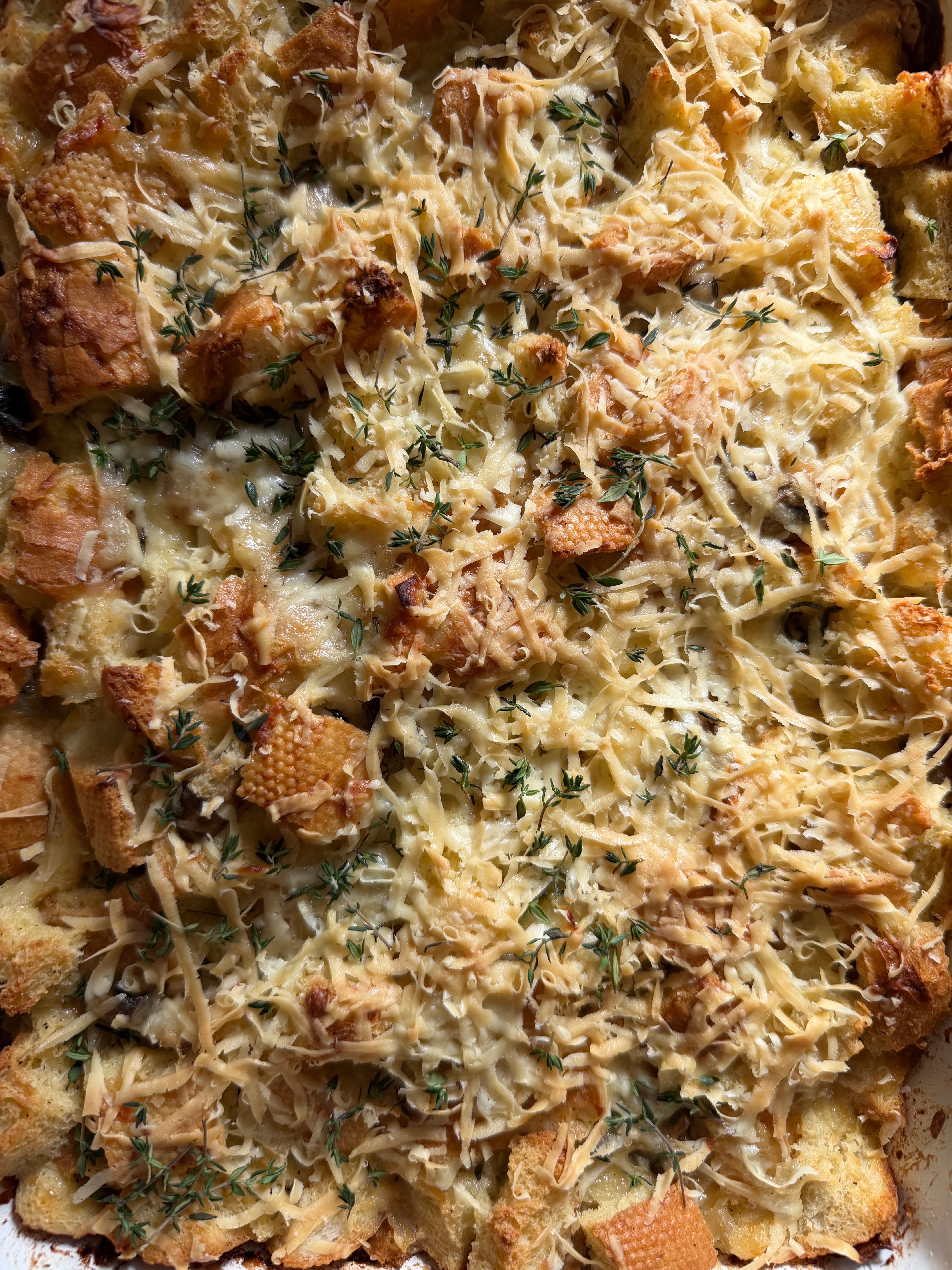 A bread pudding full of onions, mushrooms, and cheeses.
